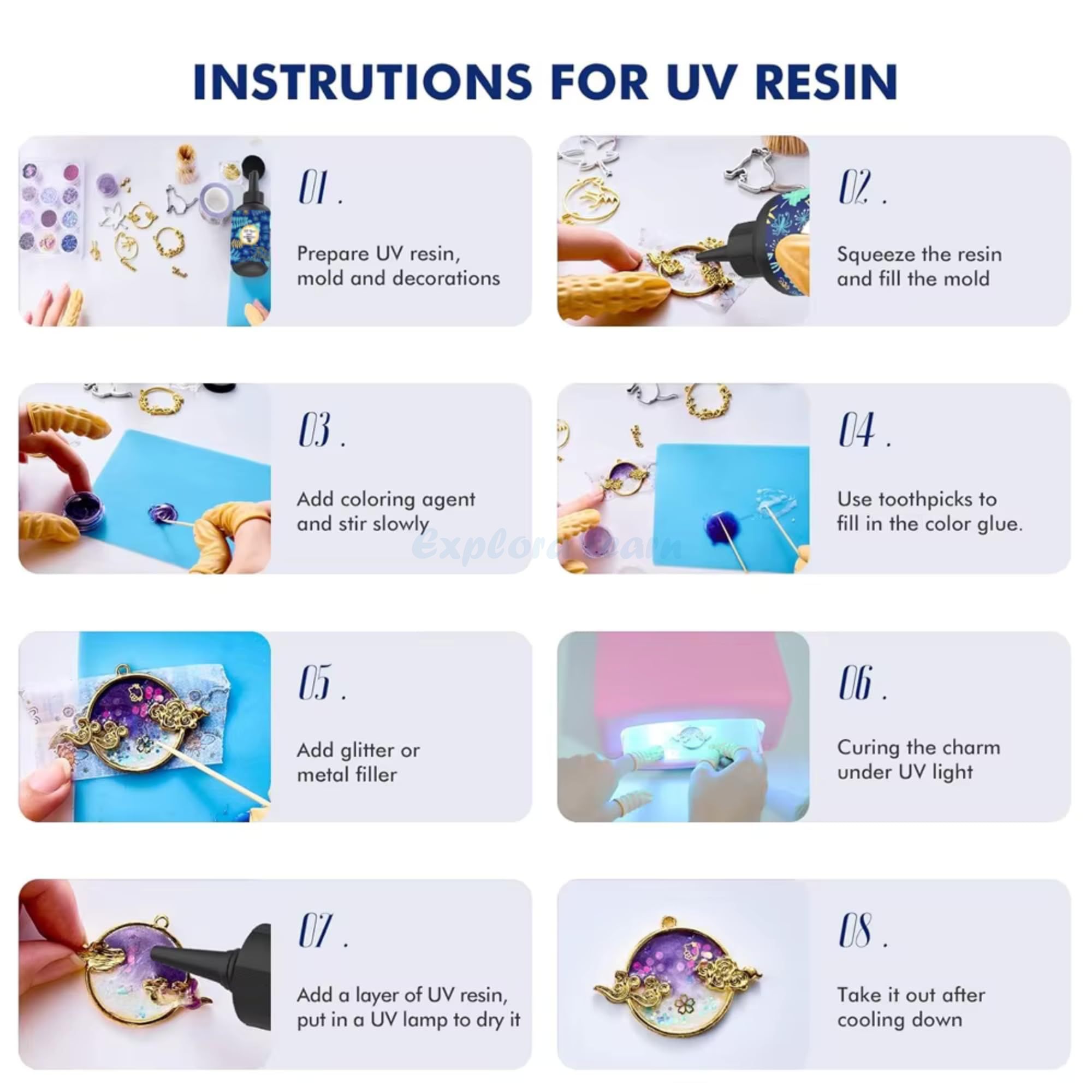 Complete beginner UV resin jewellery making kit with hard UV resin, curing light, embossed bezels, glitters, mica powders and jewellery findings. Ideal for creating pendants, earrings, keychains, and resin art projects.