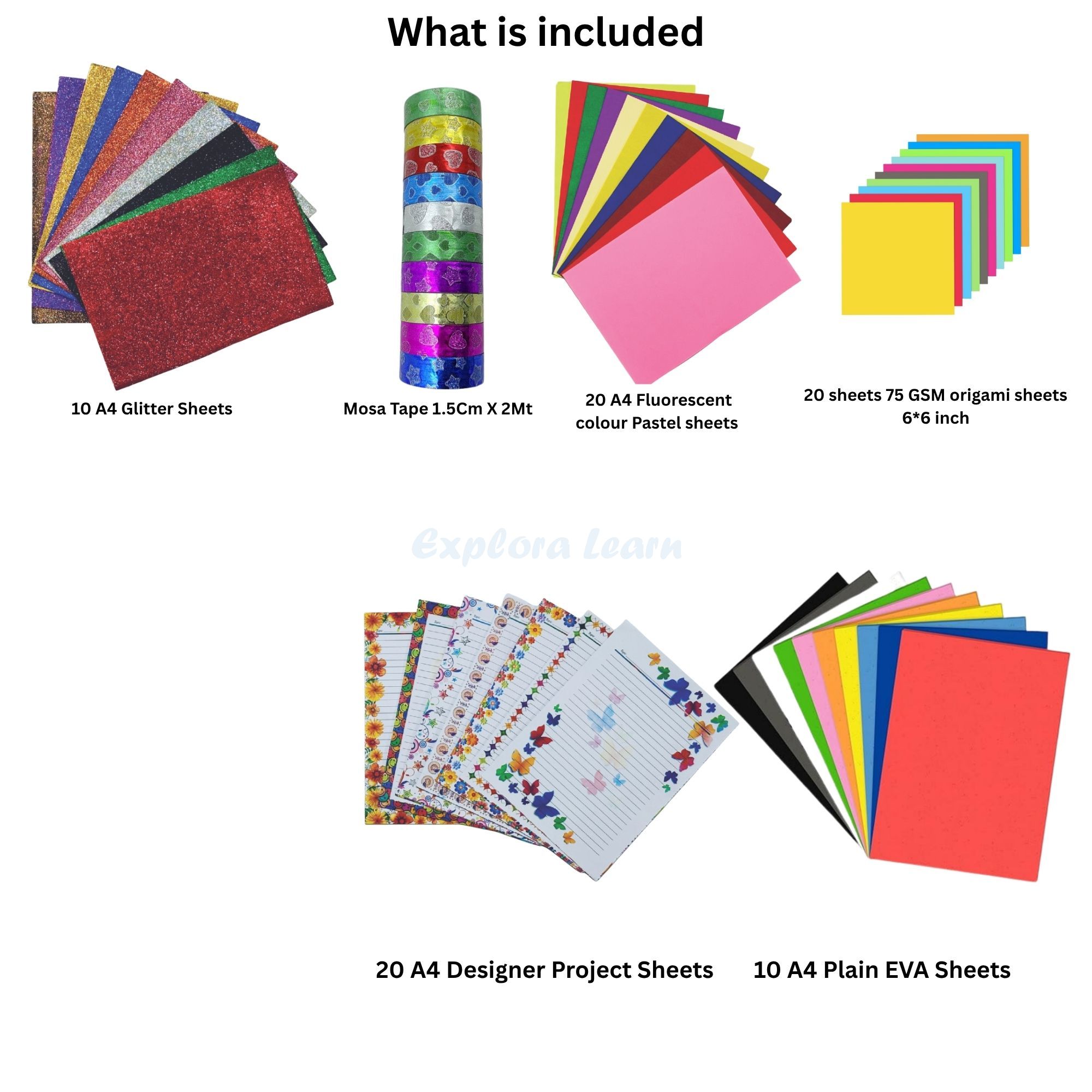Exploralearn Mega A4 Craft & DIY Material Kit is a complete all-in-one combo designed for school projects, art & craft activities and creative learning. Packed with colourful sheets and materials, it’s perfect for endless DIY ideas.