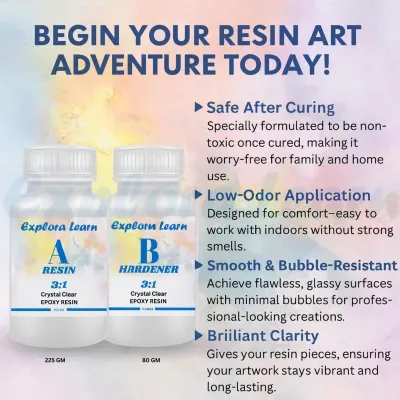 Clear, non-toxic epoxy resin and hardener in a 3:1 ratio. Provides ample working time with smooth, glossy, bubble-free results.