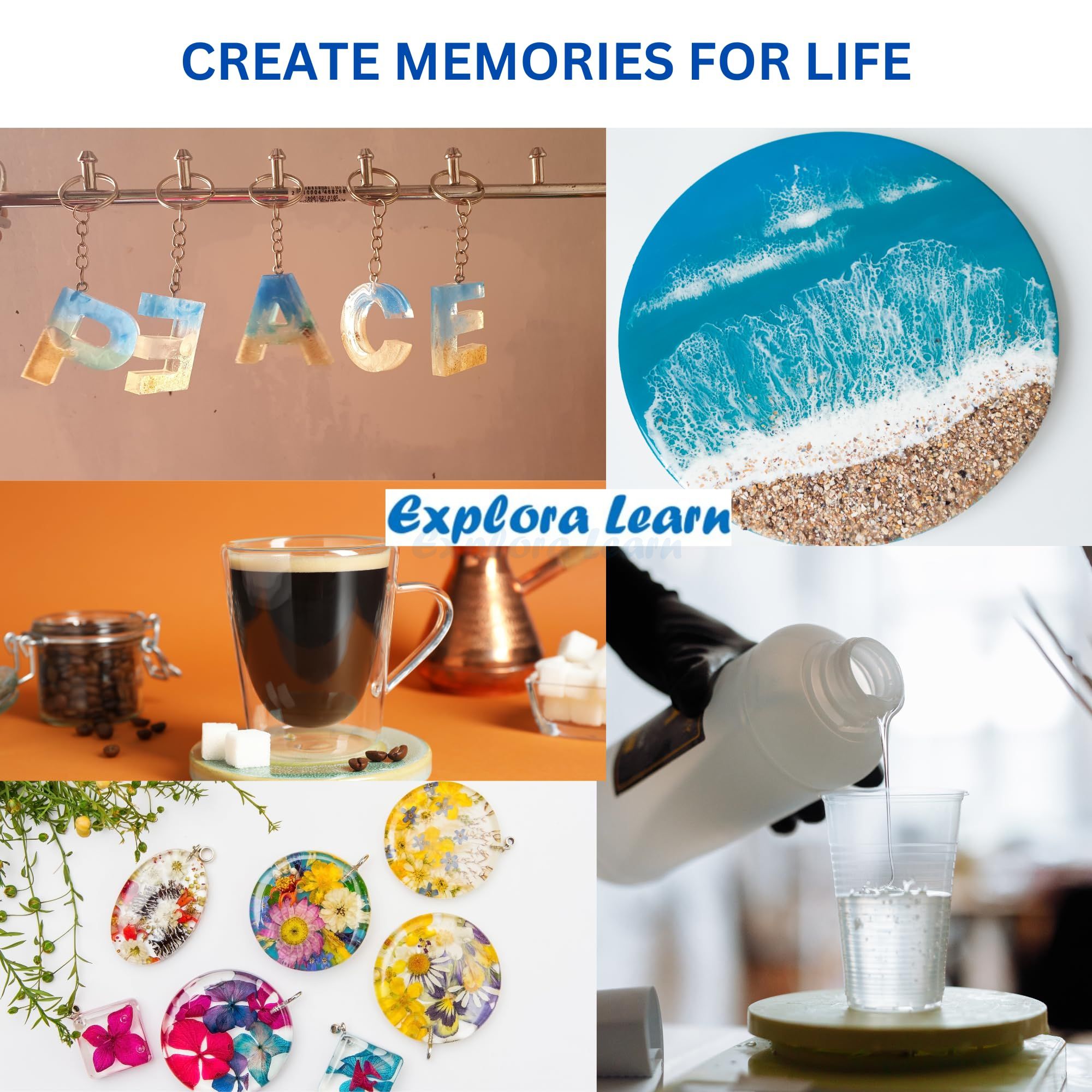 Exploralearn Ultimate Resin Art Kit - DIY Alphabet & Coaster Kit with Epoxy Resin and Silicone MoldsGet ready to explore the exciting world of resin art with the Exploralearn Ultimate Resin Art Kit. This versatile kit lets you create beautiful, personalized coasters and alphabet keychains using high-quality silicone molds and epoxy resin. Whether you're a beginner or a craft enthusiast, this kit has everything you need to bring your creative ideas to life. With a variety of decorative materials like mica powders, glitters, and flakes, your designs will be as unique as they are vibrant.Key Features:Alphabet Resin Molds: Craft your own customized resin alphabet keychains using the alphabet silicone molds included. Personalize each design with glitters, mica, and flakes for stunning results.Coaster Resin Molds: Make beautiful, functional resin coasters with the silicone coaster molds provided. Decorate them with the kits complete set of materials to create unique pieces youll love to display or gift.200 Grams of High-Quality Epoxy Resin: The kit includes 200 grams of clear, non-toxic epoxy resin and hardener. The easy-to-use 3:1 mixing ratio gives you ample working time to perfect your designs before they set.Complete Set of Resin Art Materials: From 3 mica powders and 2 types of flakes to 6 different glitters, everything you need to embellish your creations is included in this all-in-one kit.Beginner-Friendly: Designed with beginners in mind, this kit includes safety gear such as gloves and masks, along with tools like glasses and mixing sticks, ensuring a hassle-free resin crafting experience.Perfect DIY Gift for Adults: Looking for a thoughtful and creative gift? This resin art kit is perfect for adults who love DIY projects. With everything included to make custom alphabet keychains and resin coasters, its a fantastic way to inspire creativity.Bring your resin art visions to life with the Exploralearn Ultimate Resin Art Kitperfect for personal projects or gifting to your loved ones!