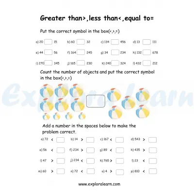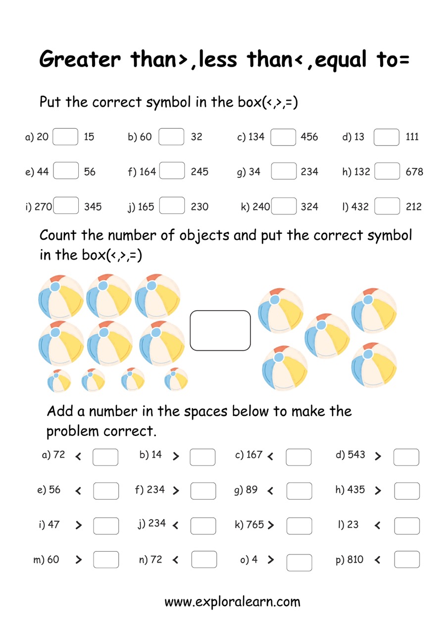 Greater than, Less than and Equal to Worksheets