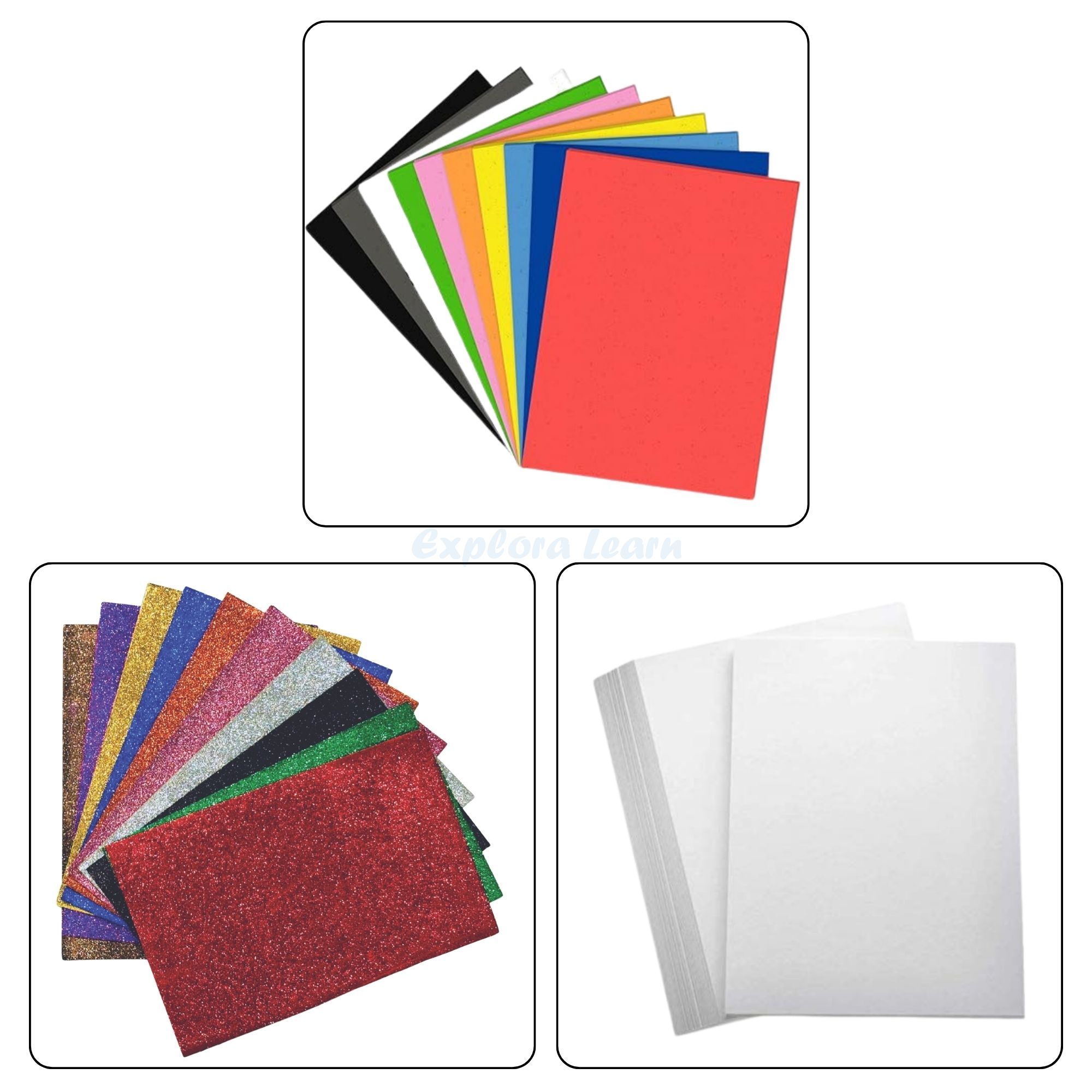 10 × A4 Glitter Non-Gumming Sheets10 × A4 EVA Foam Sheets20 × A4 Mixed Colour Single Line Sheets20 × A4 Designer Project Sheets20 × A4 Thick Pastel Sheets25 × A4 Ivory Paper (210 GSM)20 × Origami Sheets (6×6 Inch)10 pcs Mosa Tape (1.5 cm × 2 m, assorted colours)