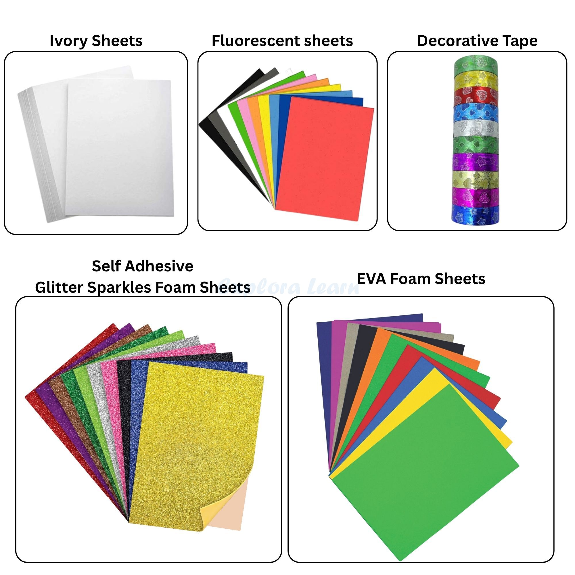10 pcs Decorative Tape (2 m each)10 pcs Mosa Tape (1.5 cm × 2 m)20 × A4 Single Line Sheets20 × A4 White Sheets20 × A4 Mixed Colour Single Line Sheets20 × A4 Thick Pastel Sheets20 × A4 Designer Project Sheets25 × A4 Ivory Paper (210 GSM)20 × Origami Sheets (6×6 Inch)10 × A4 EVA Foam Sheets10 × A4 Glitter Sheets (Non-Gumming)