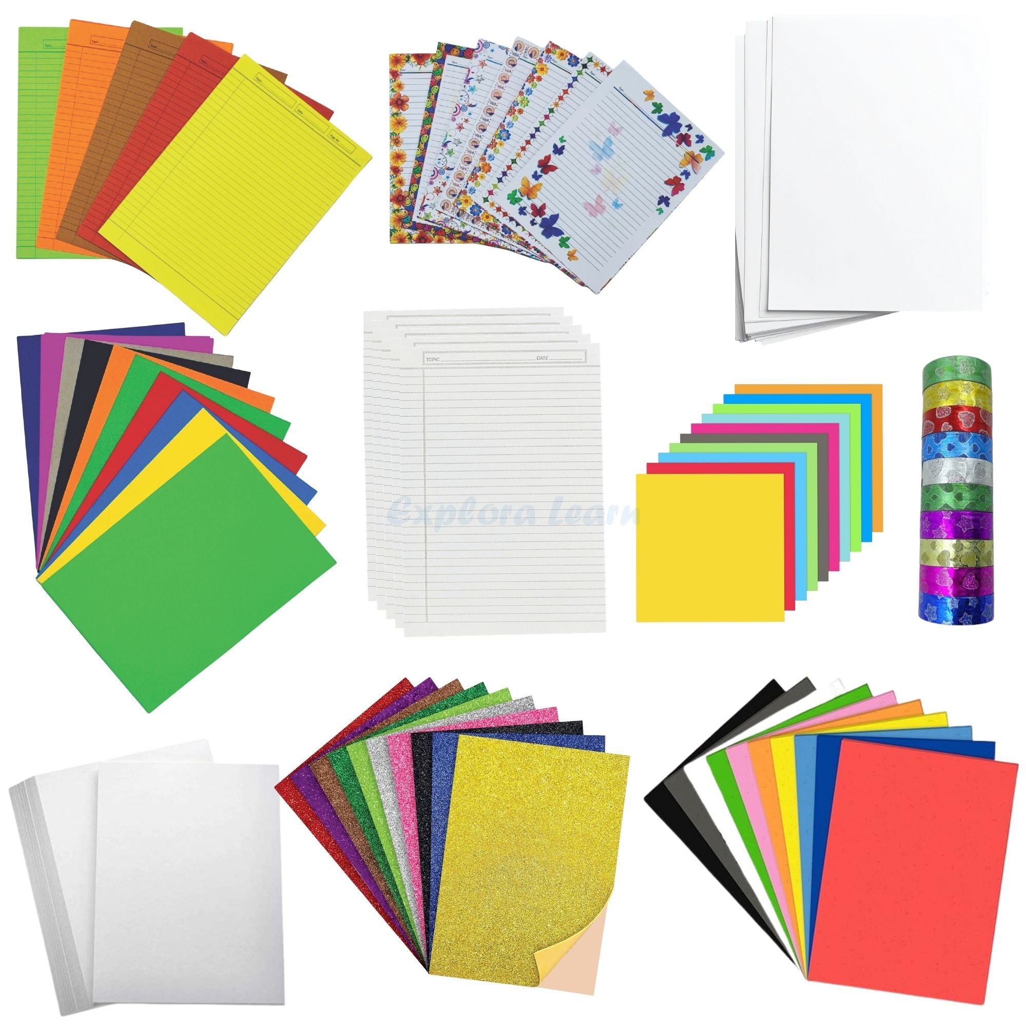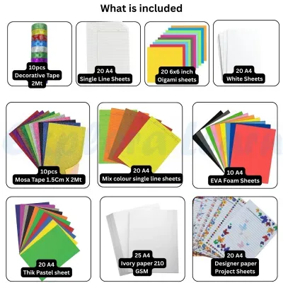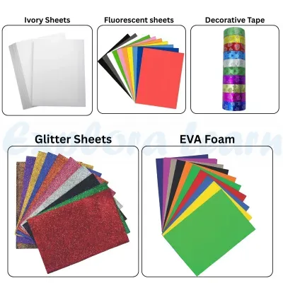 A comprehensive kit with papers, foam sheets, glitter sheets, tapes and more — perfect for charts, models, decorations and creative projects.