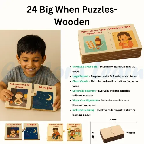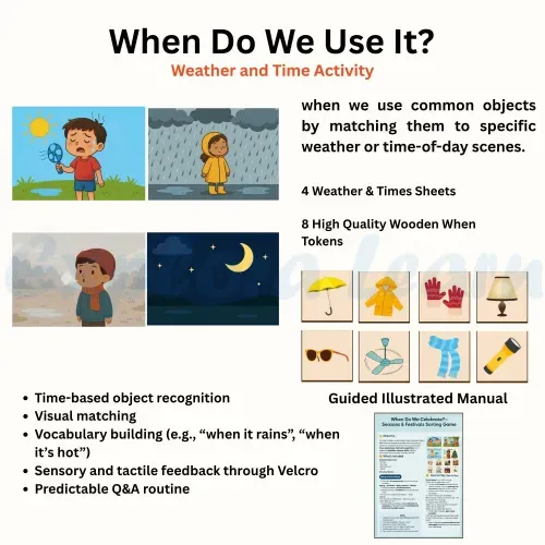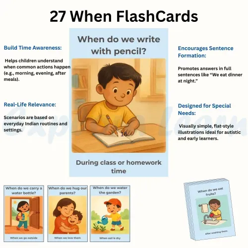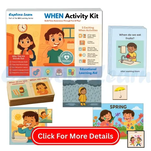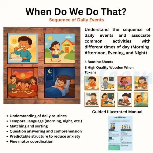 The When Activity Kit is crafted to help children understand the concept of time, sequencing, and events. It enables children to answer “When” questions like “When do you eat breakfast?” or “When do we celebrate Diwali?”—building both cognitive clarity and expressive language.