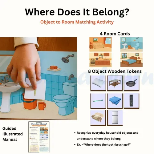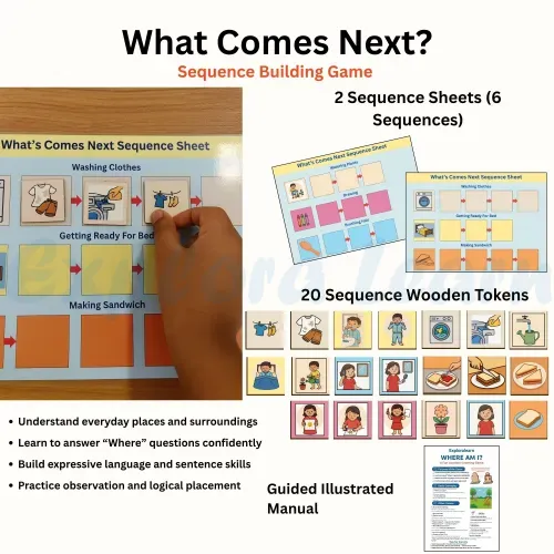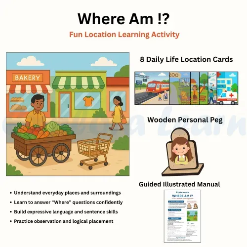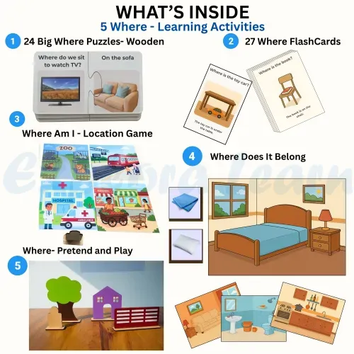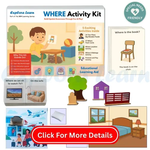 The Where Activity Kit is designed to help children understand spatial relationships, location concepts, and build foundational language skills. It supports children in answering “Where” questions using visual cues, real-world scenes, and interactive play.