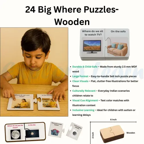 - 24 Large Wooden “Where” Puzzles – Builds understanding of common locations and spatial language